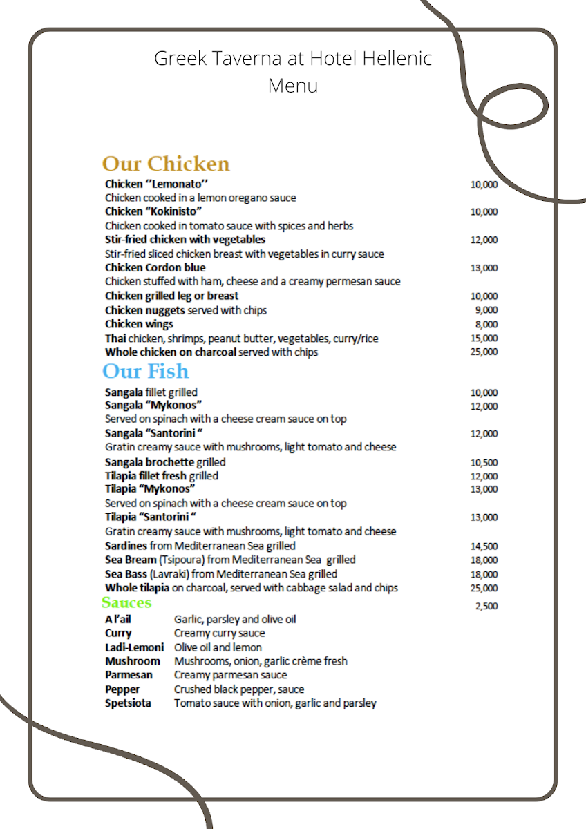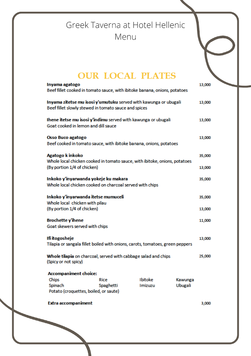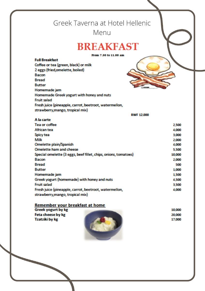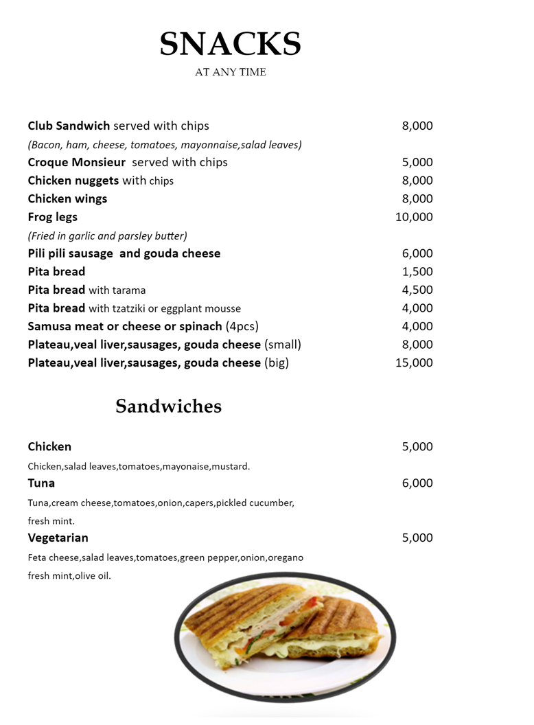 From a reviewer’s perspective, Greek Taverna’s menu at 23XH+X86, N6 KG 666 St in Kigali is a vibrant celebration of Mediterranean and classic Greek flavours, spanning from Breakfast Menu offerings through Snacks & Sandwiches, Soups, Salads, & Cold Starters, to more substantial plates like Hot Starters and Meat dishes, all designed to cater to diverse tastes. Diners will find beloved Mediterranean staples such as Greek salad, refreshing cold starters and rich, hearty hot options that set the tone for a satisfying meal. The Meat section showcases traditional Greek preparations, often paired with sides that highlight the restaurant’s authentic style, and while exact prices aren’t always displayed online, standout classics like moussaka, stifado and grilled meat plates are typically presented at reasonable price points that match the quality and generous portions you’d expect from this Kigali favourite. Across the menu, there’s a balance of light, fresh choices and rich, comforting main courses, which together offer a complete Greek dining experience that keeps patrons coming back for both the familiar and the flavorful.