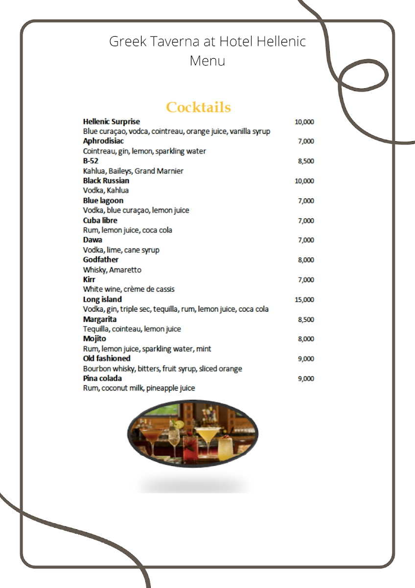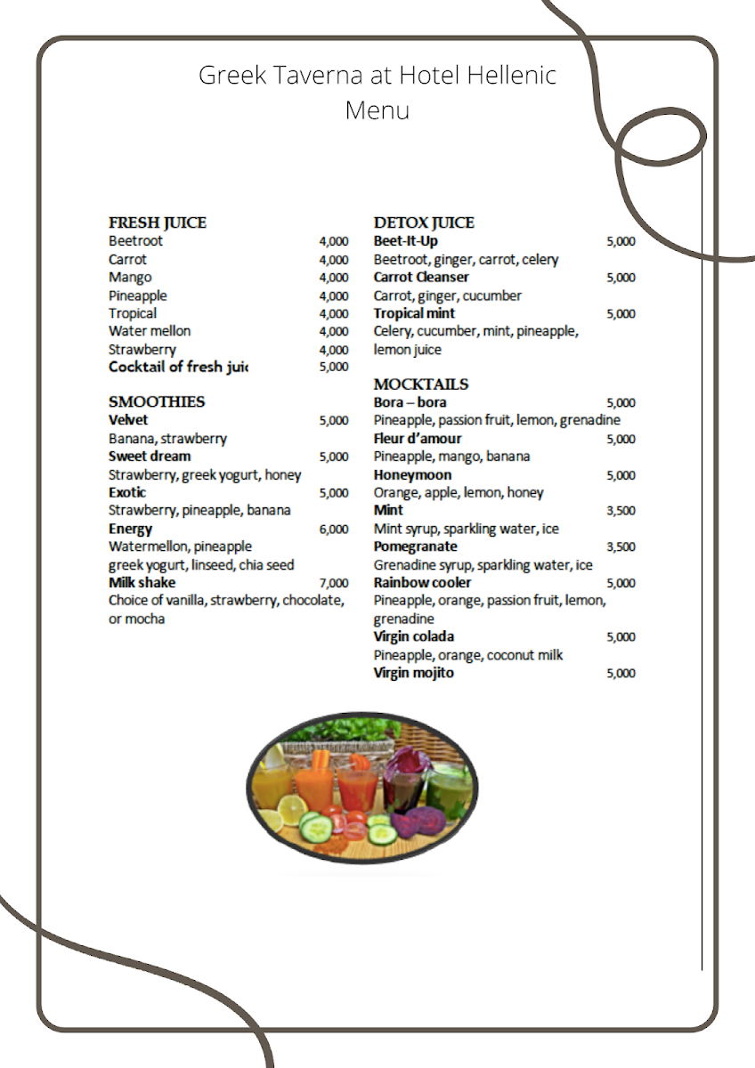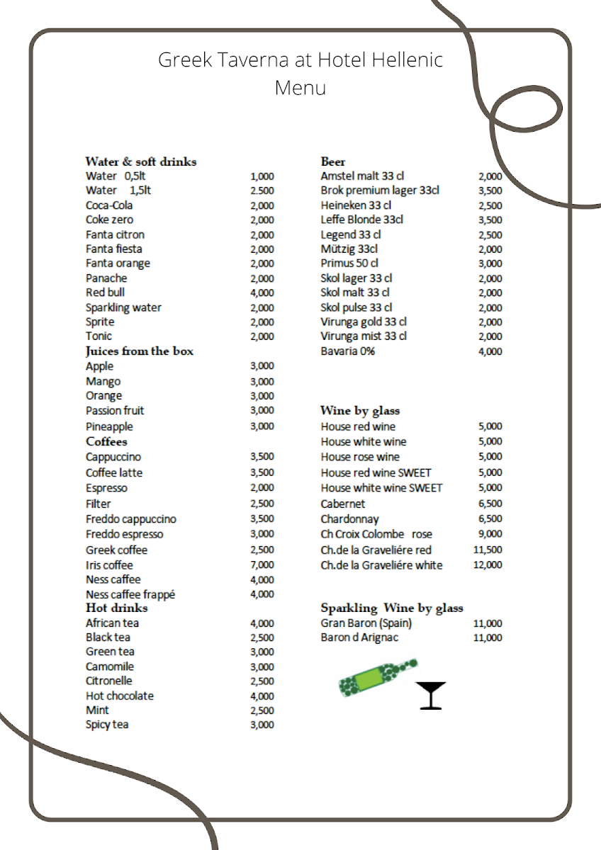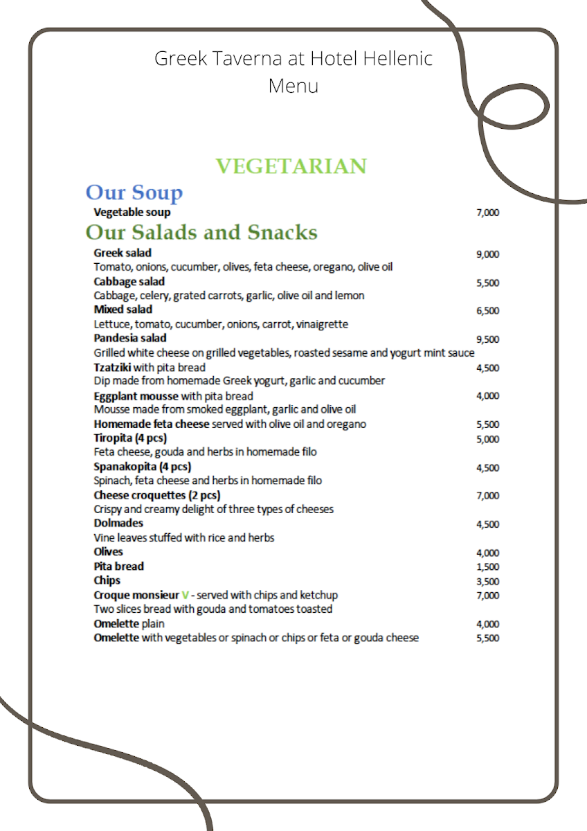 From a reviewer’s perspective, Greek Taverna’s menu at 23XH+X86, N6 KG 666 St in Kigali is a vibrant celebration of Mediterranean and classic Greek flavours, spanning from Breakfast Menu offerings through Snacks & Sandwiches, Soups, Salads, & Cold Starters, to more substantial plates like Hot Starters and Meat dishes, all designed to cater to diverse tastes. Diners will find beloved Mediterranean staples such as Greek salad, refreshing cold starters and rich, hearty hot options that set the tone for a satisfying meal. The Meat section showcases traditional Greek preparations, often paired with sides that highlight the restaurant’s authentic style, and while exact prices aren’t always displayed online, standout classics like moussaka, stifado and grilled meat plates are typically presented at reasonable price points that match the quality and generous portions you’d expect from this Kigali favourite. Across the menu, there’s a balance of light, fresh choices and rich, comforting main courses, which together offer a complete Greek dining experience that keeps patrons coming back for both the familiar and the flavorful.